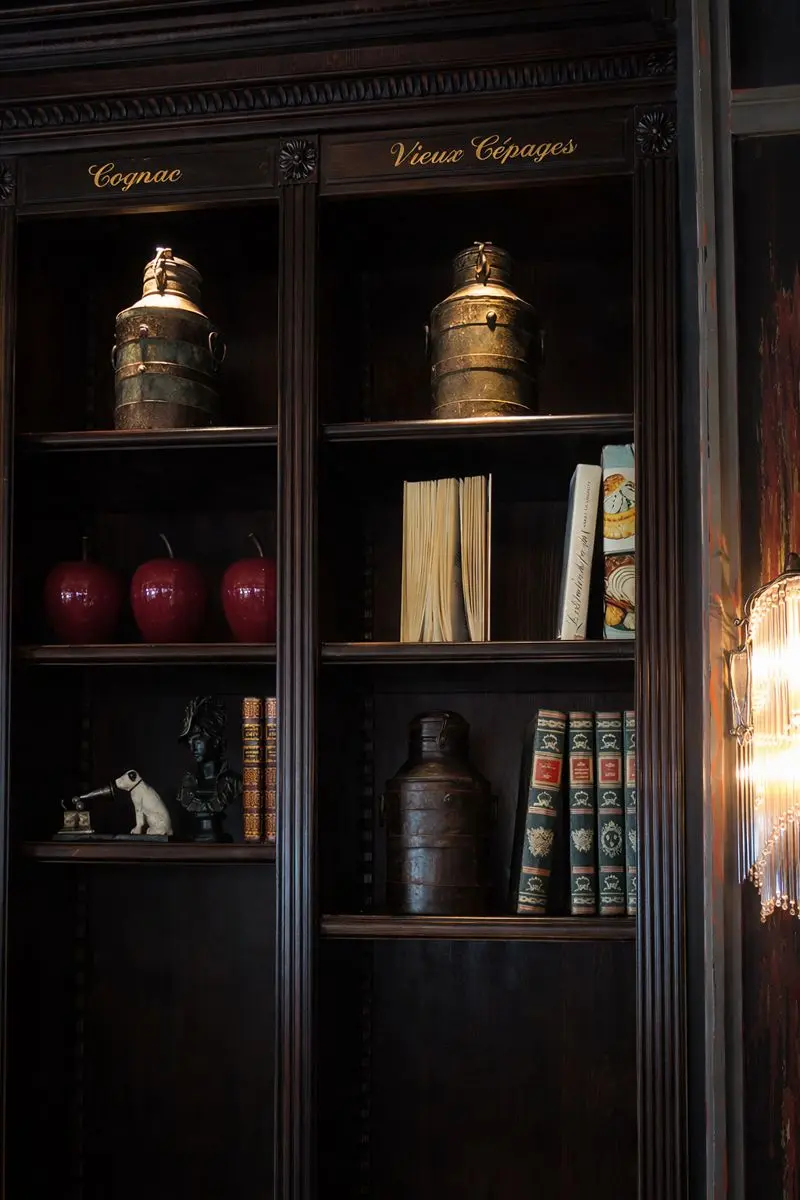 En façade, la faïence murale sur mesure capte la lumière et annonce l’atmosphère. À l’intérieur, les carreaux de ciment dessinent le sol comme une mémoire en mouvement. Le mobilier encaustiqué, le poêle prussien, les matières patinées composent un décor chaud, dense, habité. Ici, rien n’est figé : le passé affleure, se ressent, et dialogue avec le présent.