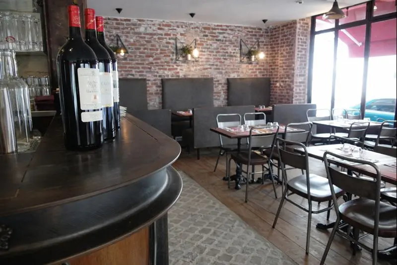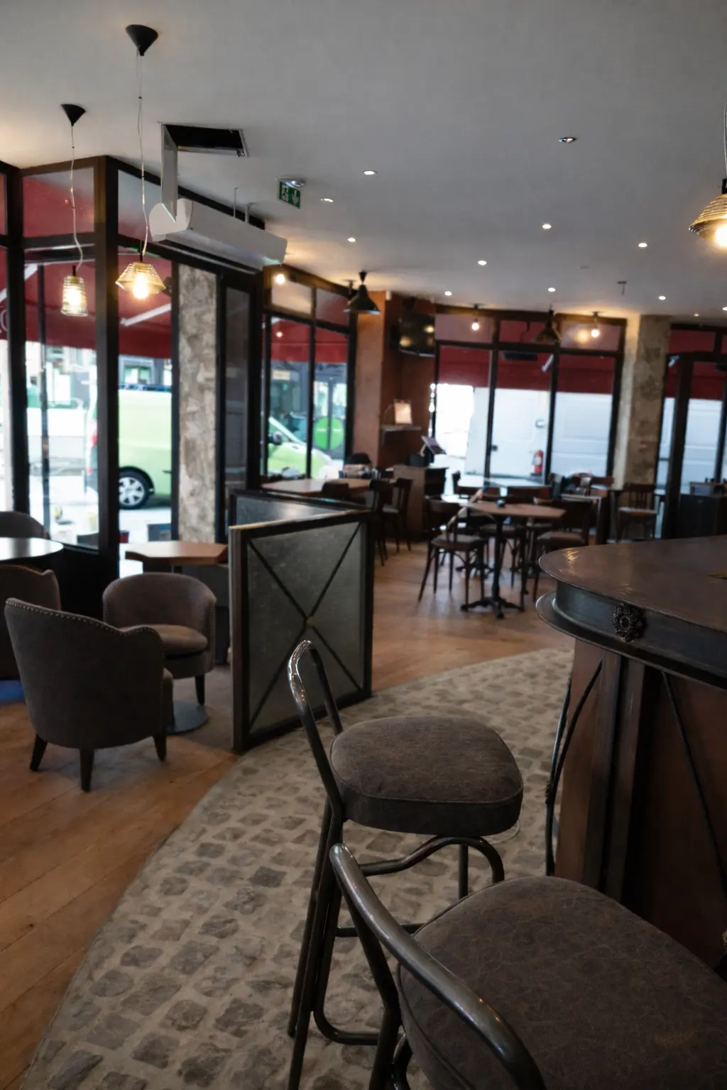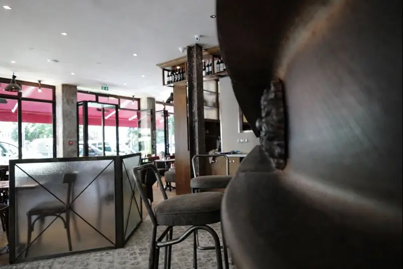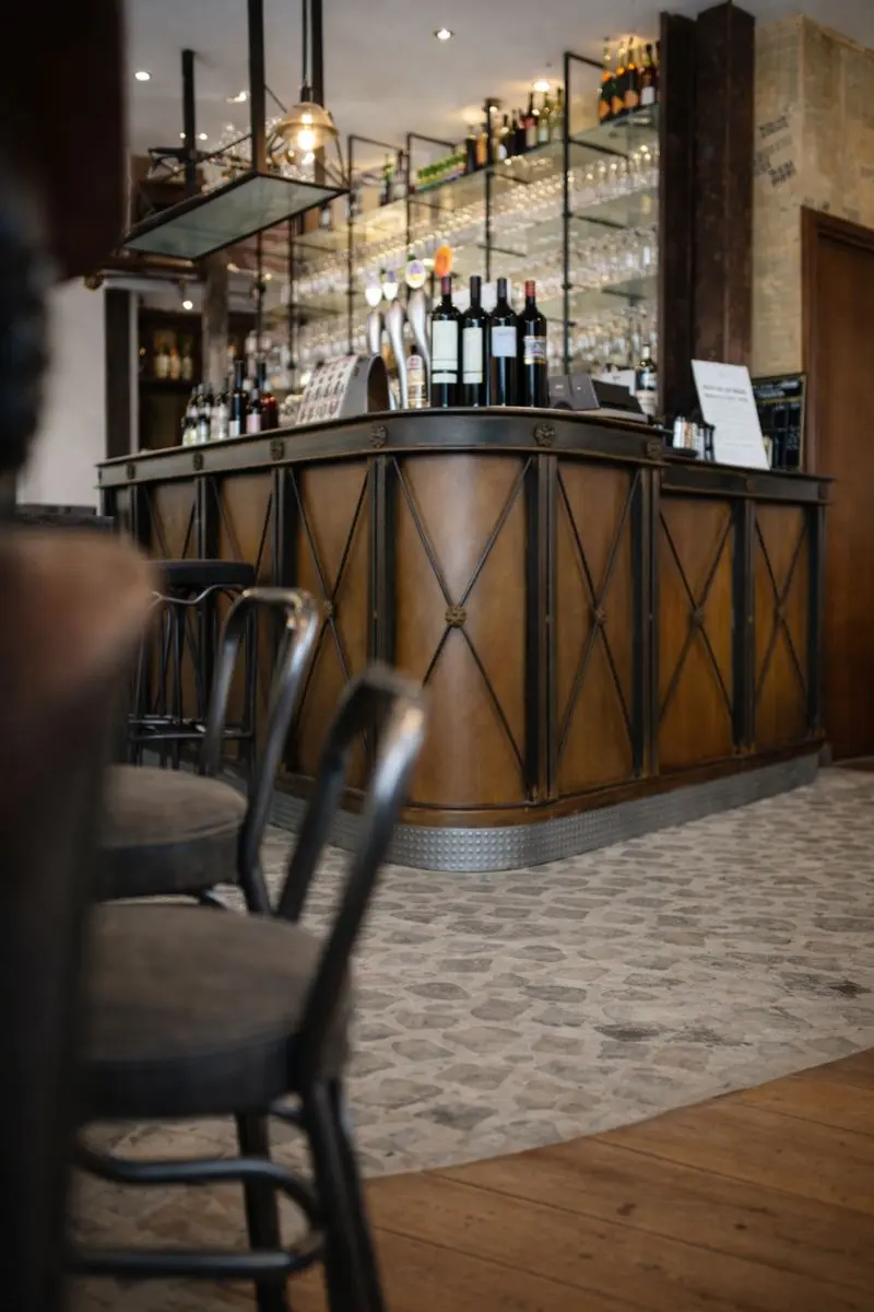 Le chemin pavé guide le pas autant que le regard, comme une trace laissée par la circulation des hommes. Il mène vers un bar en IPN courbé, inspiré des anciens nez de piste industriels, puis vers des linteaux en acier volontairement visibles, témoins d’un savoir-faire assumé.
