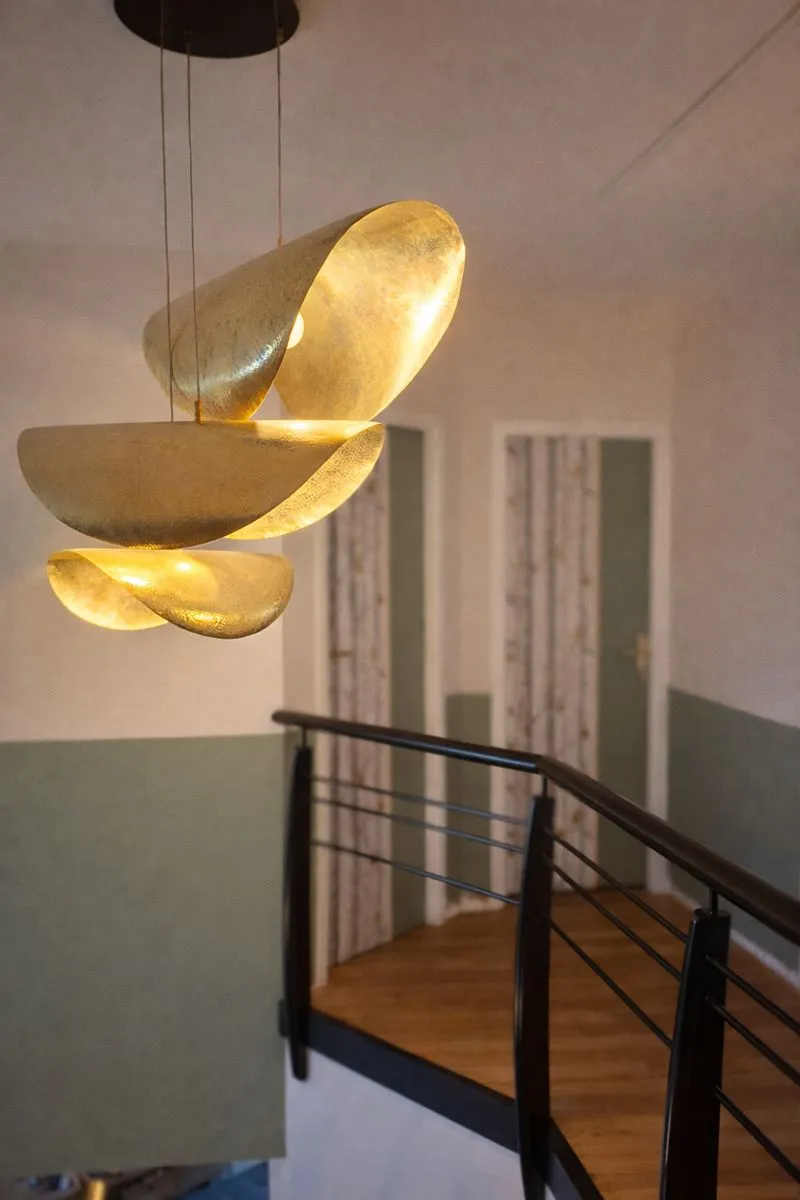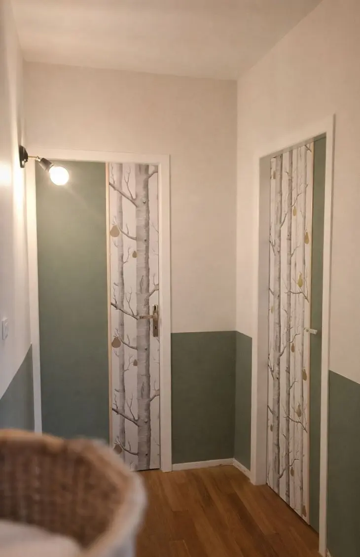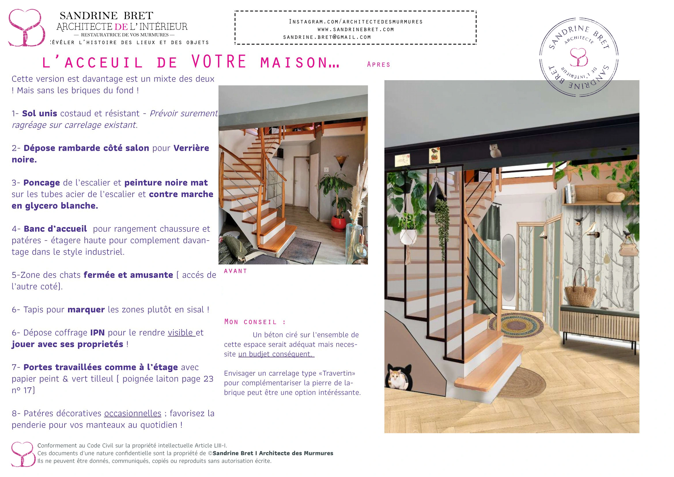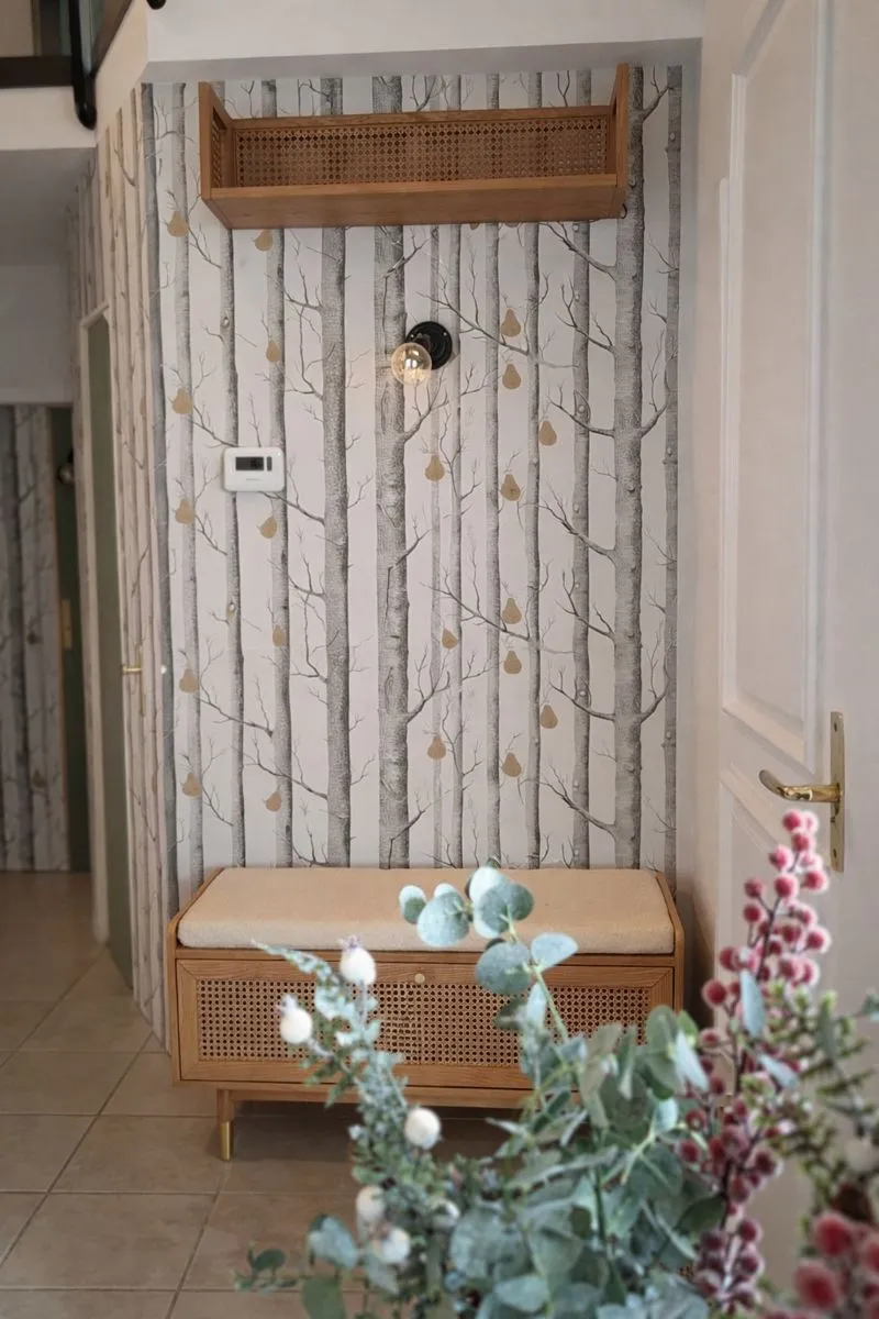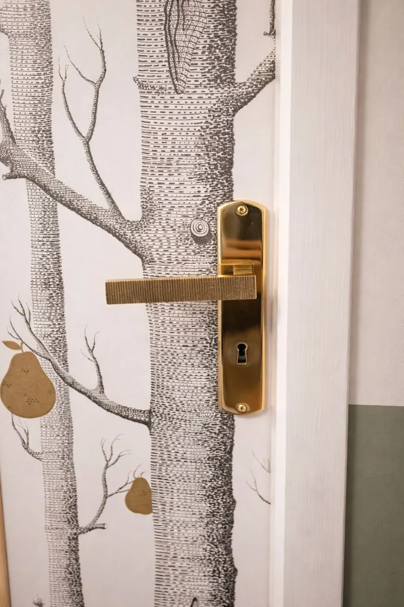 Cette famille a choisi d’offrir une nouvelle vie à sa maison à travers une rénovation pensée comme un projet de cœur. Le fil conducteur s’est imposé naturellement : le poirier, symbole de prospérité, de douceur et de patience. Dès l’entrée, le papier peint aux poires dorées installe une atmosphère accueillante et raffinée, prolongée par un travail graphique sur les portes et des luminaires en laiton, échos subtils au motif.