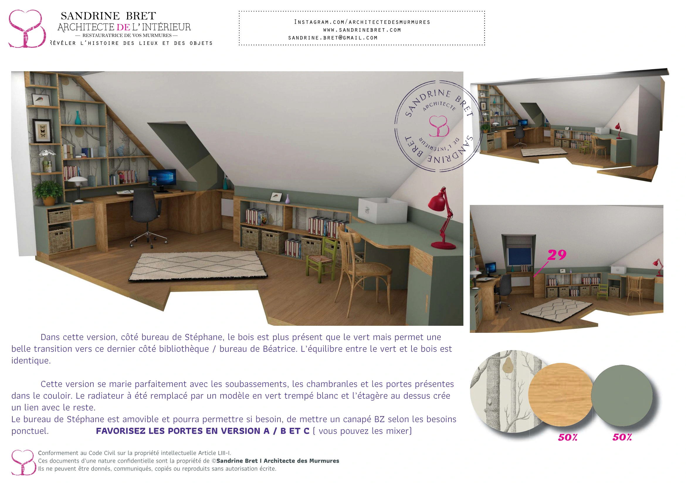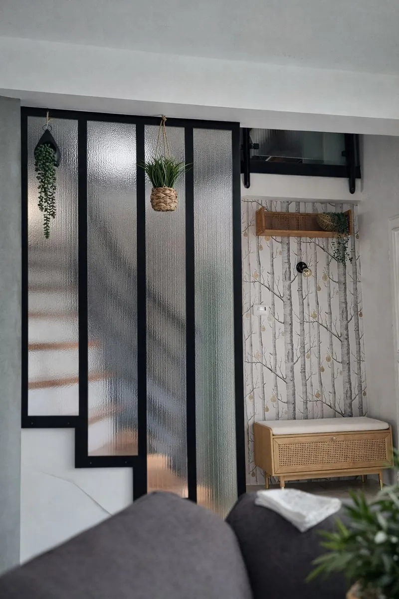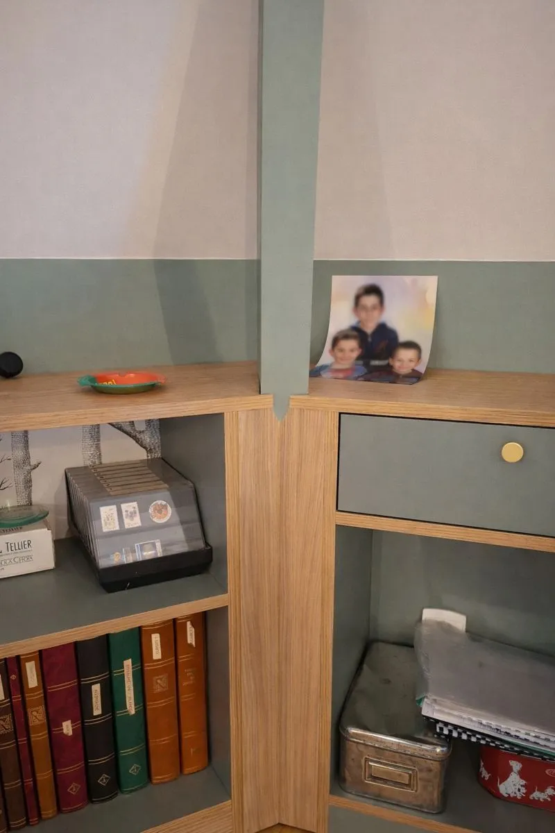 La circulation a été repensée pour plus de fluidité et de lumière. La rambarde de l’escalier s’allège grâce à une verrière en verre Masterline, tandis que l’étage accueille un aménagement sur mesure transformant la mezzanine en un espace fonctionnel et harmonieux : bureau, zone de couture et rangements intégrés.